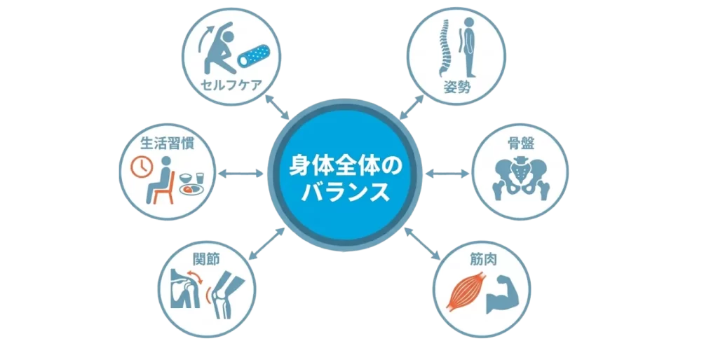 痛みの改善を目指すためには、まず痛みが出ている部位だけでなく、身体全体の状態を把握することが重要とされています。姿勢や骨盤のバランス、筋肉の使い方、関節の動きなどを総合的に確認し、不調の背景にある要因を整理することで、より適した施術につながります。