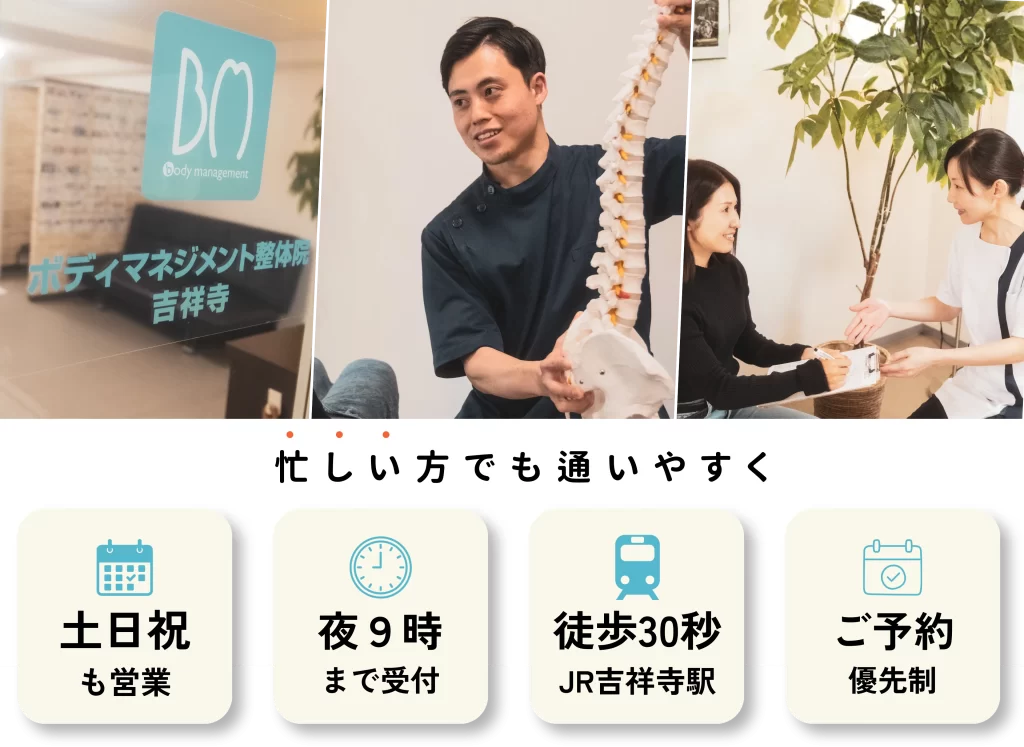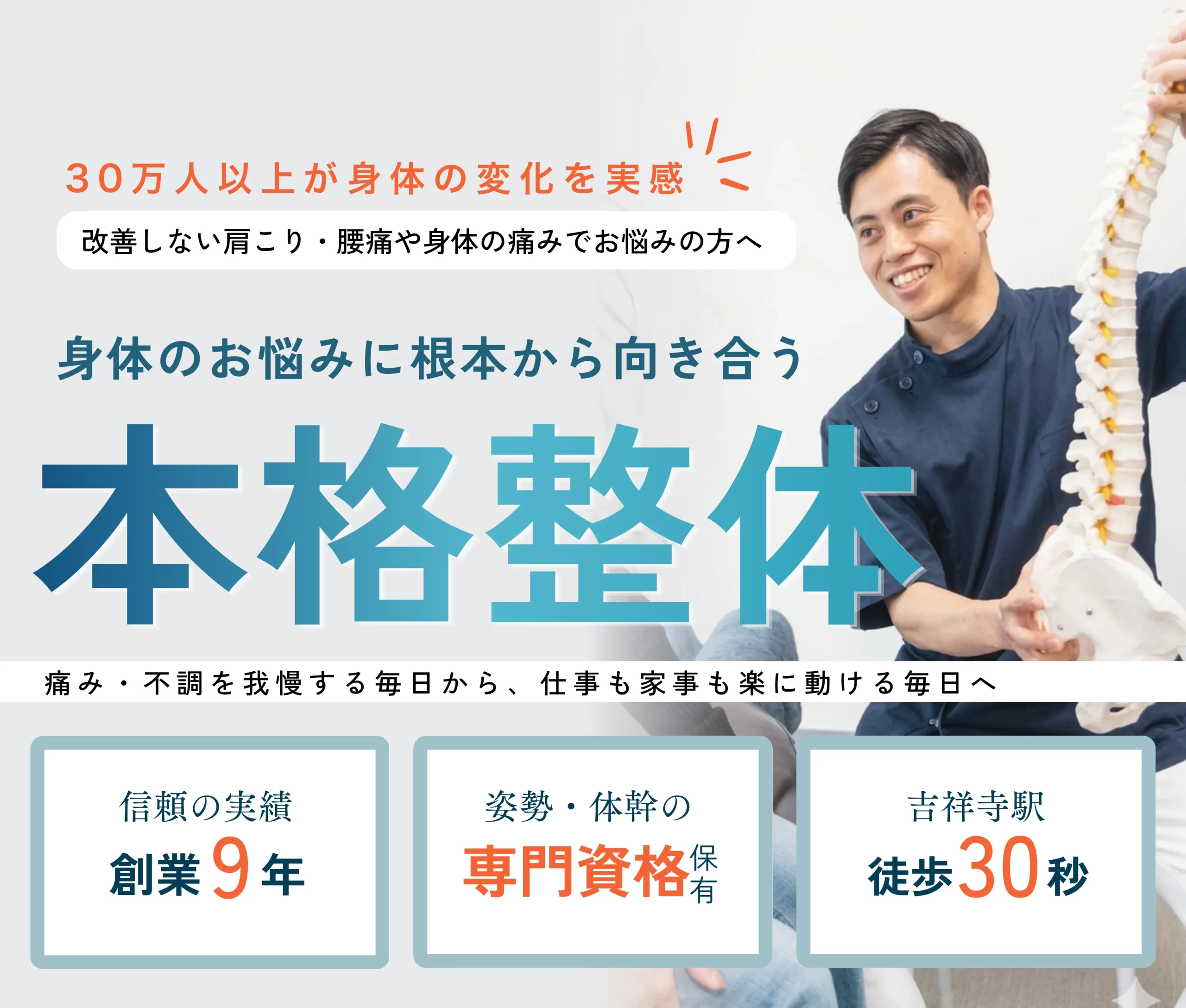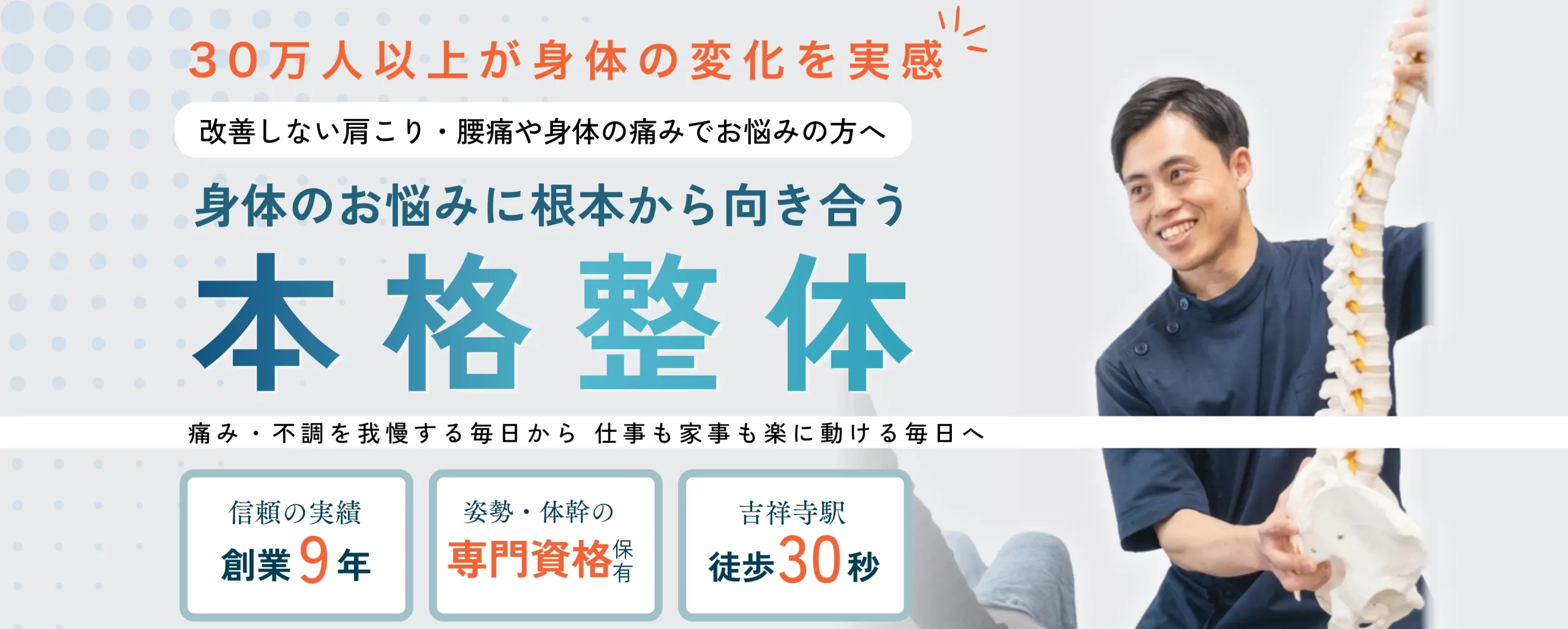 はじめまして。ボディマネジメント整体院吉祥寺院 院長の小林です。順天堂大学を卒業後、大手整体院に入社し、2店舗で院長を務めてまいりました。その中で、多くのお客様のお身体と向き合いながら、技術力だけでなく「根本改善」に向けた考え