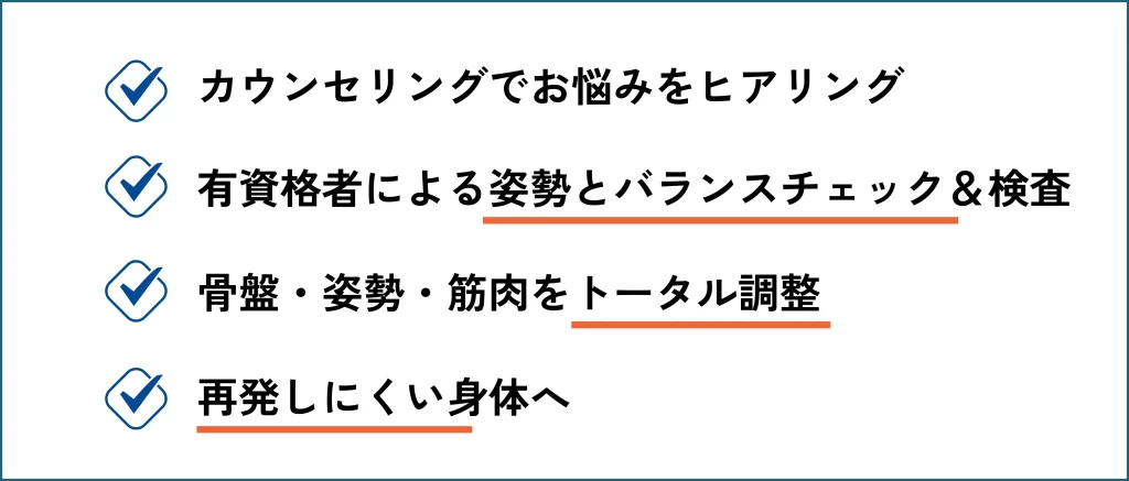 カウンセリングの内容をもとに、姿勢評価や骨盤・脊柱の状態を確認してお悩みの原因を明確にしたのちに、関節可動域、筋緊張のバランスも細かく検査します。さらに、立位・座位・歩行などの基本動作や日常的に繰り返している体勢が身体に過剰な負担をかけていないかも確認します。