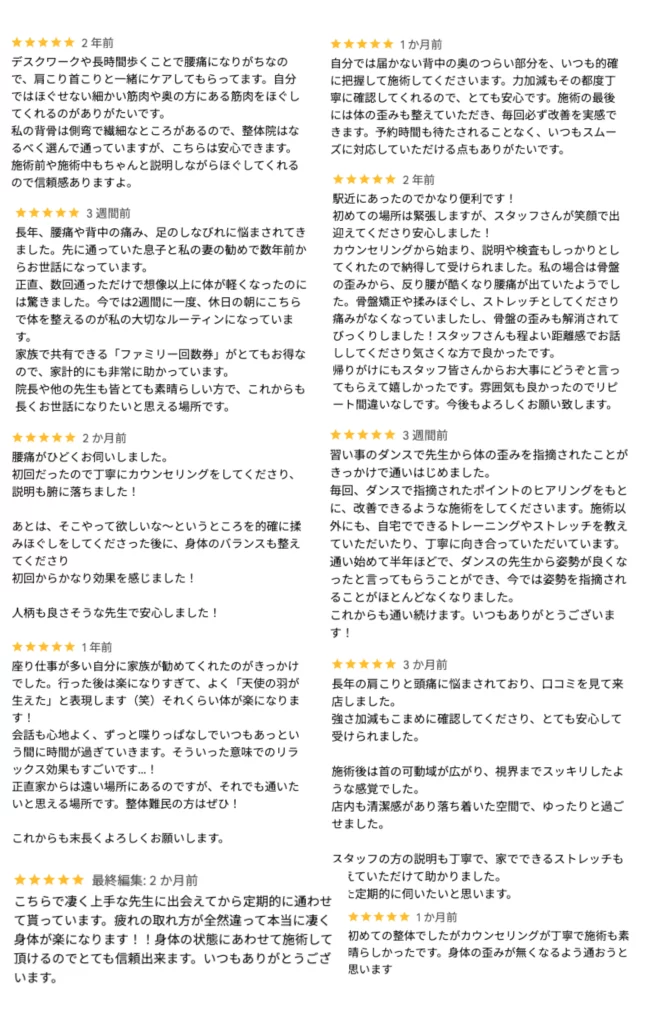 お身体の状態を把握している担当者が、姿勢や動作のポイント、セルフケアの方法などをその都度アドバイスいたします。施術だけで終わらせず、術後も寄り添いながらサポートすることで、不安を感じにくく、安心して身体と向き合っていただける環境を整えています。