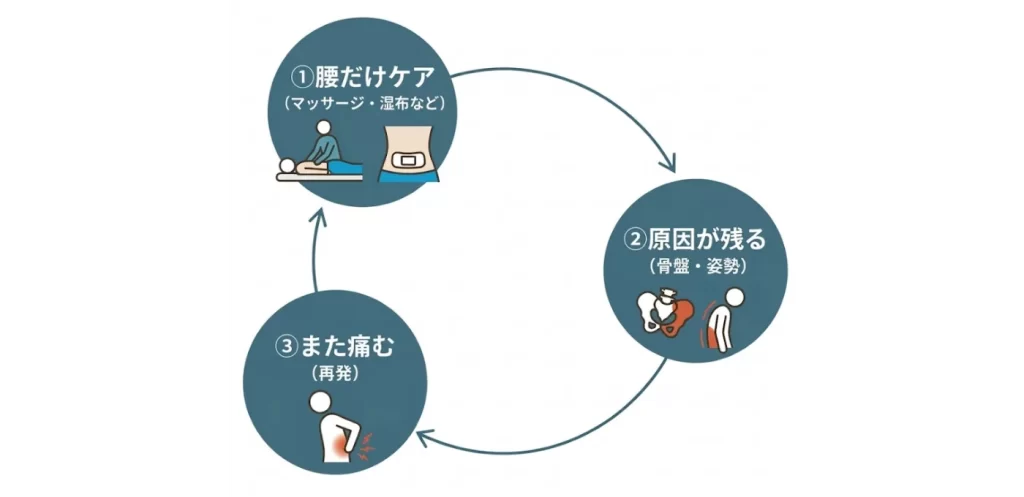 腰をほぐしたり温めたりすると一時的に楽になることはありますが、骨盤の傾きや姿勢、身体の使い方が変わらないままだと、再び同じ場所に負担がかかりやすくなります。
