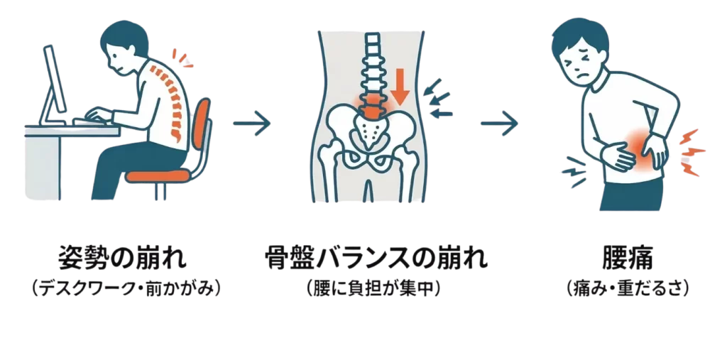 骨盤や背骨のバランスが崩れることで、身体を支える力が分散されず、腰に負担が集中することもあります。